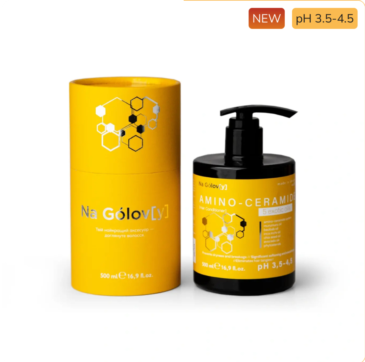 HAIR CONDITIONER AMINO-CERAMIDE -Аміно-церамідний кондиціонер для волосся 5 екзотичних олій ТМ «Na Gólov[y]» забезпечує ефективне кондиціонування та сприяє легкому розчісуванню. Комплекс екзотичних олій і фітостеролів сприяє зволоженню, пом’якшенню та надає еластичності волоссю. Кондиціонер зберігає доглянутий вигляд волосся, забезпечує гладкість і блиск, усуває сплутування.