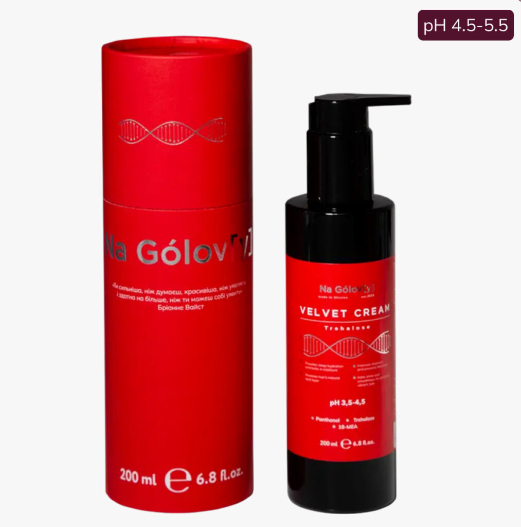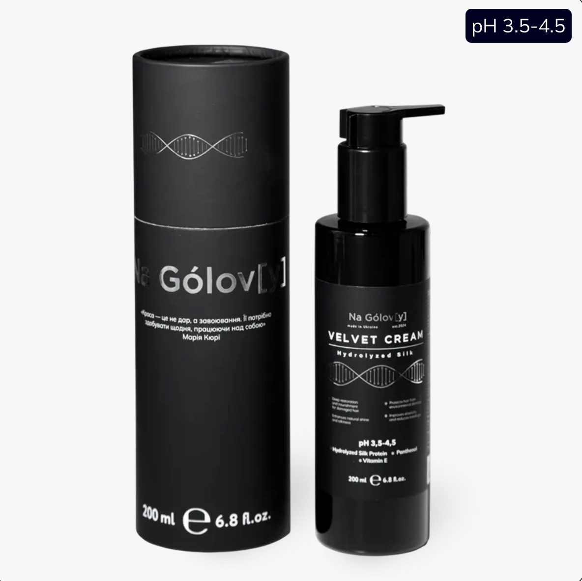 Leave-in conditioner cream with hydrolyzed silk VELVET CREAM Na Golov[y] – заповнює пошкодження глибоко біля кортексу, зміцнює структуру, додає щільності. Це справжня міць і пружність волосся.